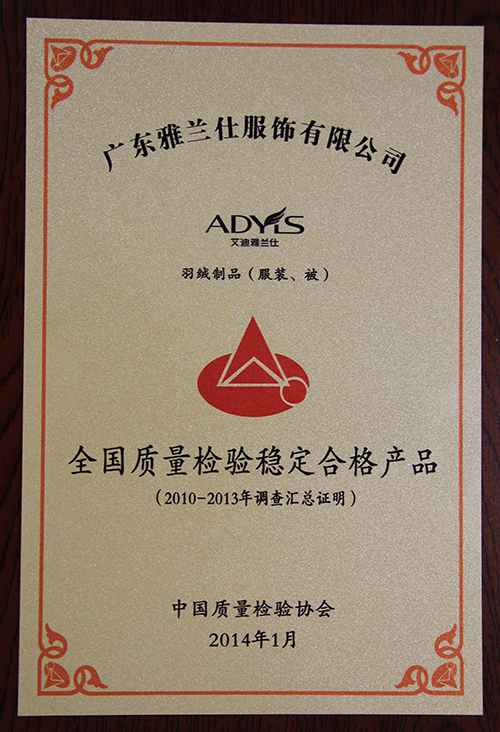 雅蘭仕獲得全國(guó)質(zhì)量檢驗(yàn)穩(wěn)定合格產(chǎn)品認(rèn)證