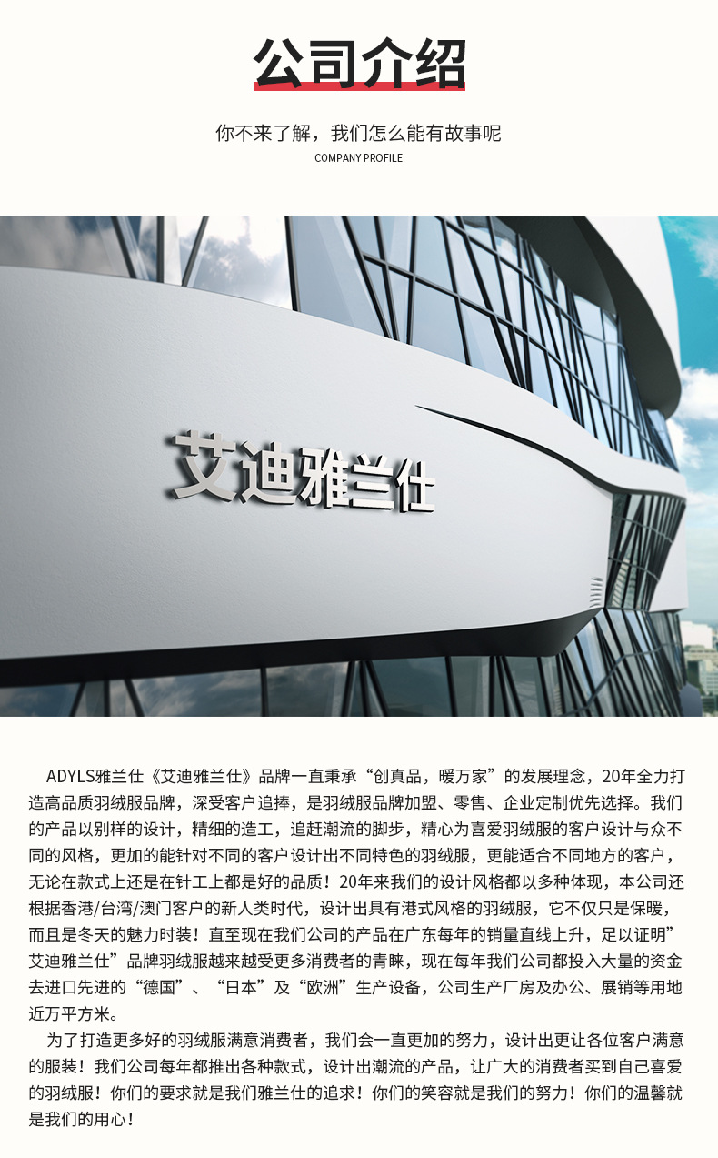 雅蘭仕《艾迪雅蘭仕》是著名品牌羽絨服公司,集羽絨服廠家、羽絨服供應(yīng)商、羽絨服批發(fā)商、羽絨服零售商于一身。公司設(shè)計、開發(fā)、專業(yè)生產(chǎn)高品質(zhì)羽絨服飾及床品系列產(chǎn)品,主要產(chǎn)品有:男女裝、童裝羽絨服,羽絨背心,羽絨被。 雅蘭仕羽絨服,高品質(zhì)追求,四層造藝,可洗衣機洗滌,清洗簡單不費力;360度立體技術(shù),清洗后的保暖效果保持不變。